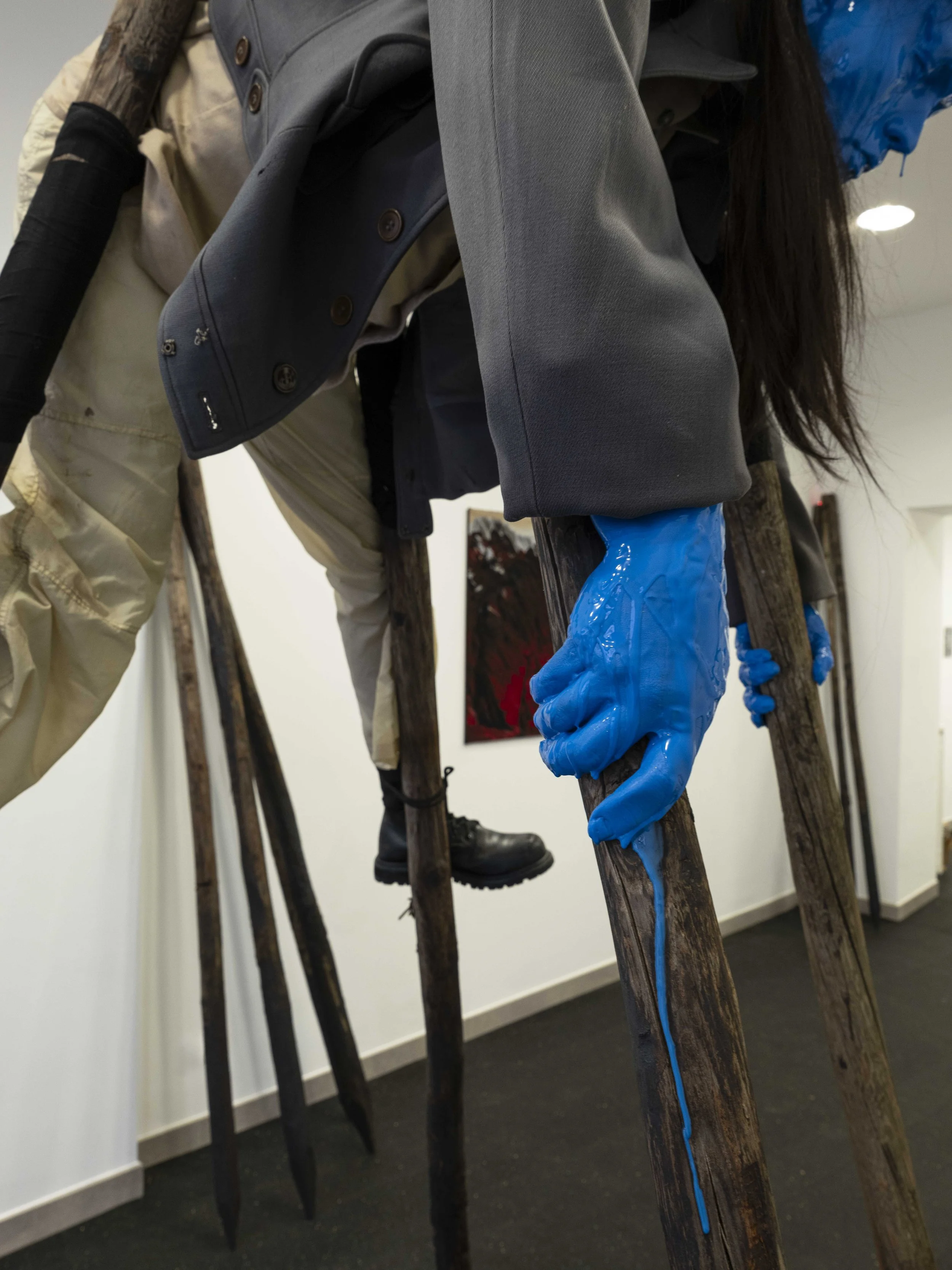 We have gone quite far now, through the tar, and through the mud as well. Decay is everywhere, especially farther down below. We’ve tried everything to protect ourselves from it. We come from the abandoned farms. We have always supported what needed support: the exhausted apple trees in the Old Land, the limbs. When we came through the open field, we picked up a body and hung it up to dry. It is a Chinese rubber body without a gaze. Its jacket looks as though the body once had a function, was in service, stood in someone’s service. In whose service? We’re constantly being signaled. We can’t decipher it. We dream of the haystacks of the farms, which are now deserted. If we could, we would lay the body in the hay to dry. The body hangs on the stakes—or is it kneeling, devout? It is resting, dripping out, getting ready for the next service.
